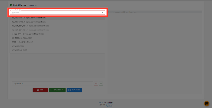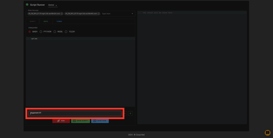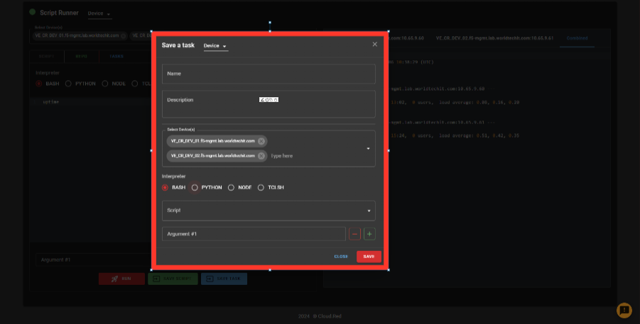 - Task: A script that is associated with one or more F5 devices for execution. Tasks can also have predefined arguments if the script requires them.