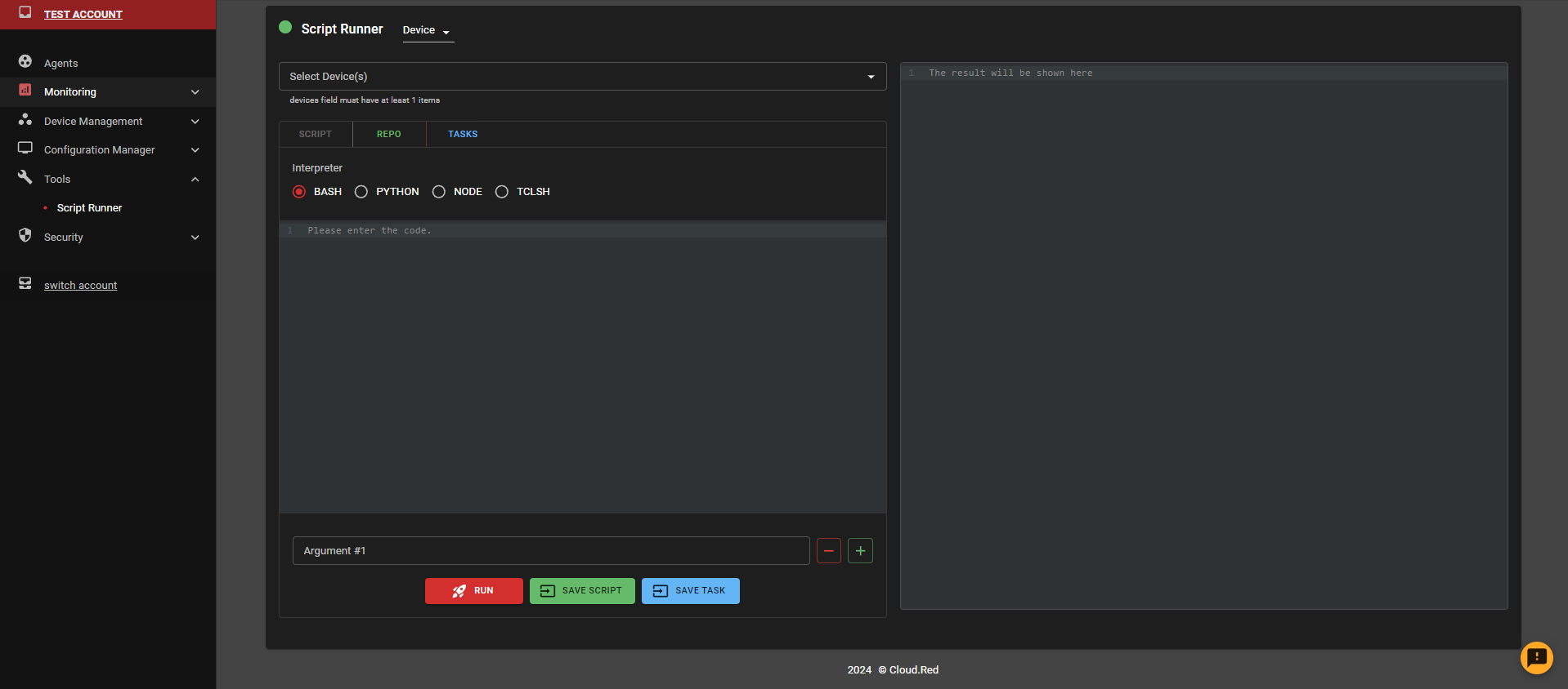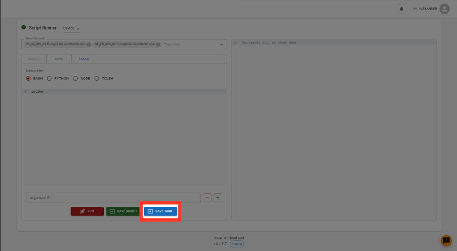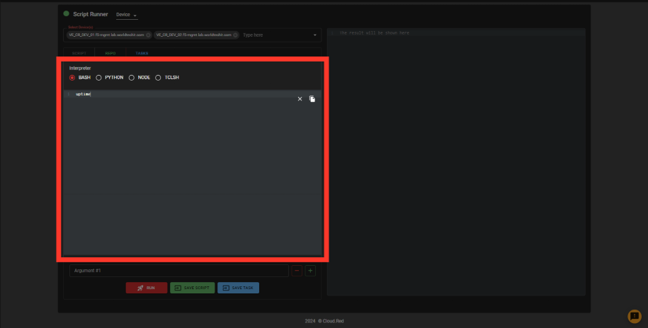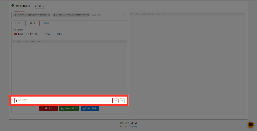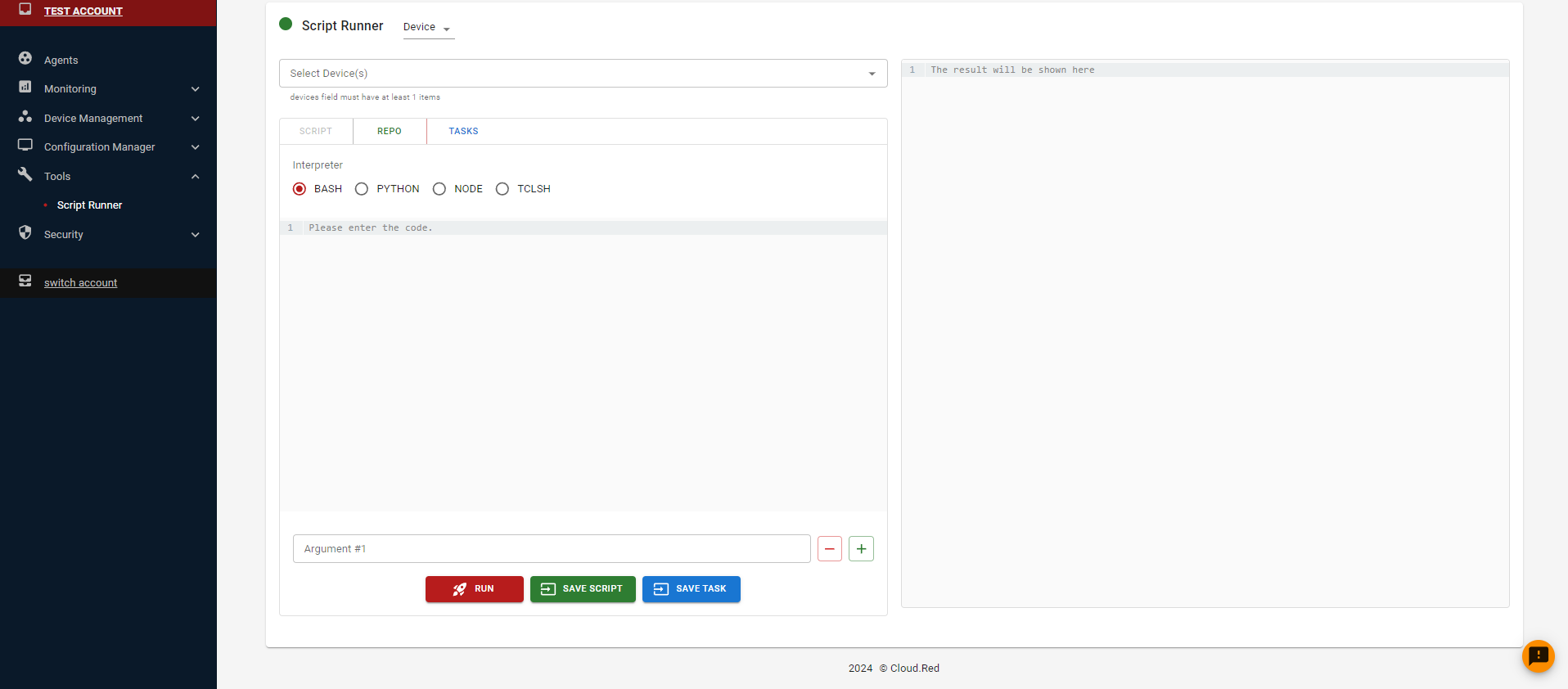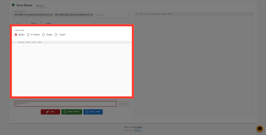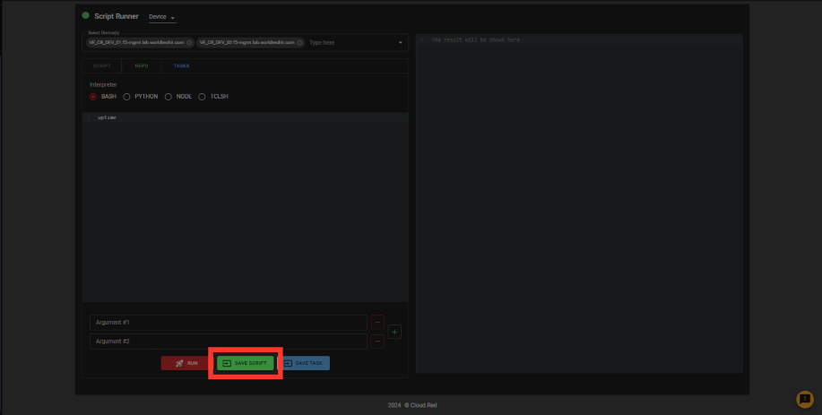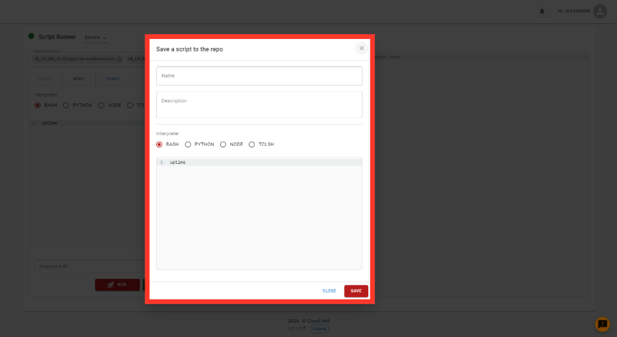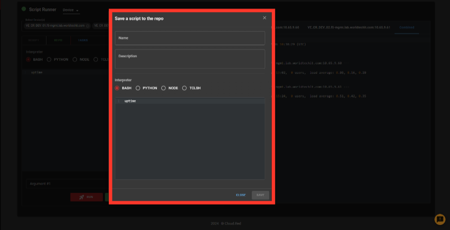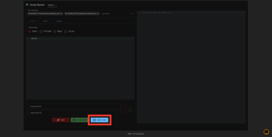 - When saving a task to the repository, provide the name, description, the script and the devices that the script is intended to be run on.